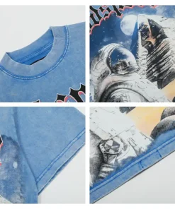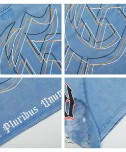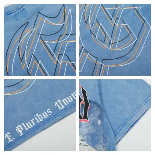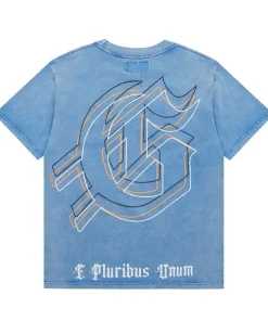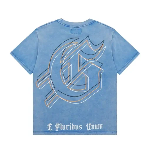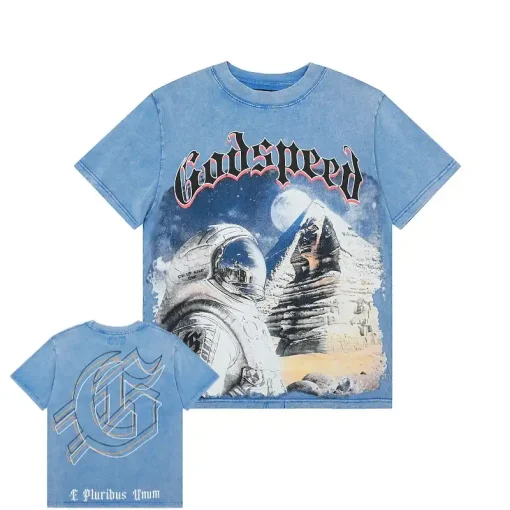 - This tee with a bold and imaginative design. On the front, the word “Godspeed” is prominently displayed in a large, ornate font at the top. Below it, there’s a vivid graphic depicting an astronaut alongside the Sphinx and a pyramid, with a celestial body (like the moon or a planet) in the background, creating a surreal blend of space exploration and ancient Egyptian imagery. The back of the T – shirt features a large, stylized “GS” logo, and at the bottom, the Latin phrase “E Pluribus Unum” is visible.