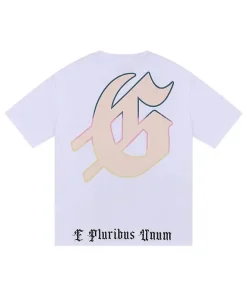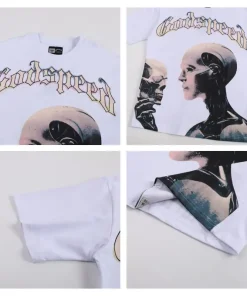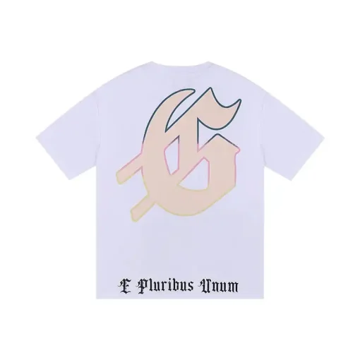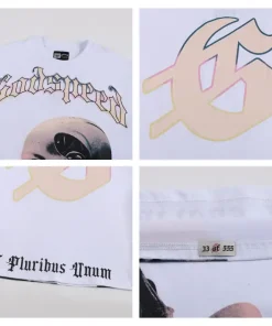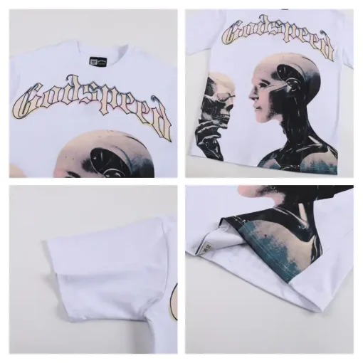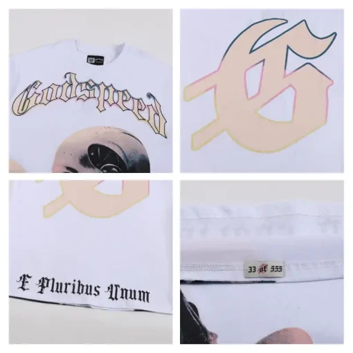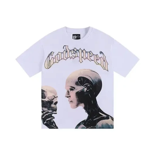 - This tee with a bold and thought – provoking design. On the front, the word “Godspeed” is prominently displayed in an ornate, golden – hued font at the top. Below it, there’s a vivid graphic depicting a skull and a robotic – looking human figure facing each other, creating a striking contrast between mortality and futuristic technology. The back of the T – shirt features a large, stylized “GS” logo, and at the bottom, the Latin phrase “E Pluribus Unum” is visible.