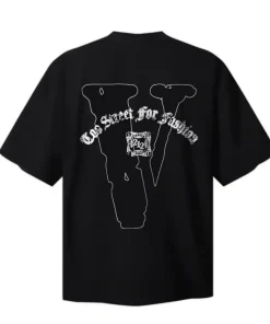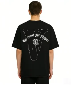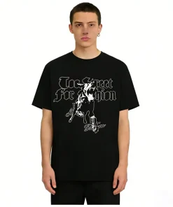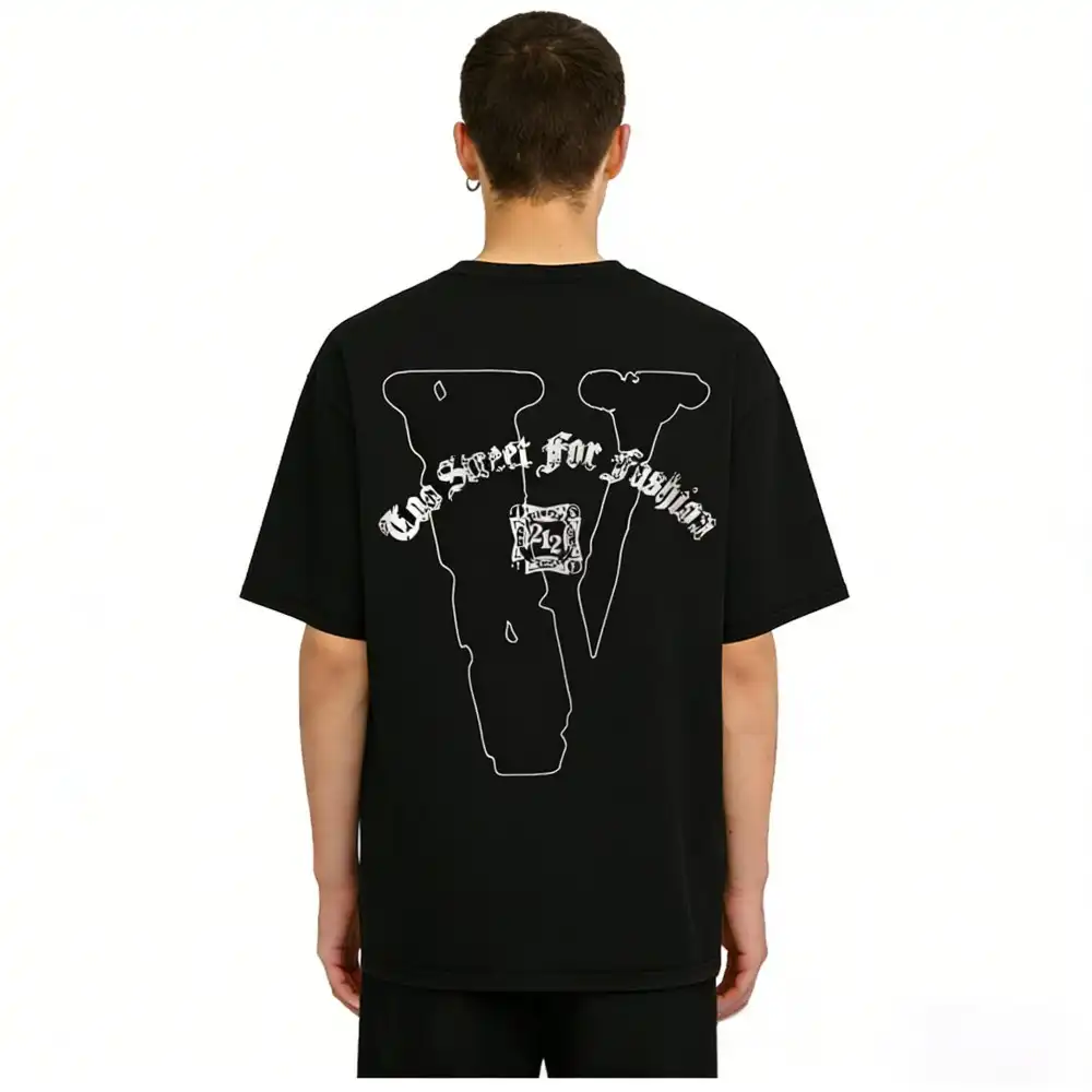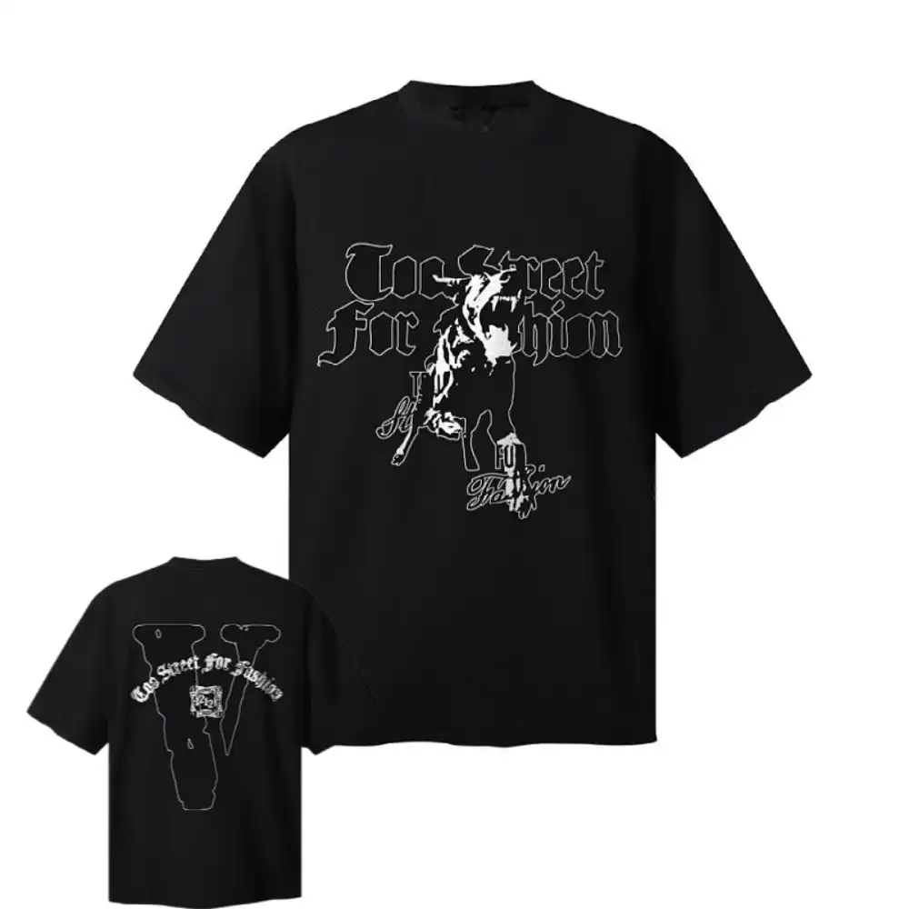 - This bold streetwear tee features a front graphic with the phrase “Too Street for Fashion” in a dramatic black gothic font, centered around a striking silhouette of a cowboy on horseback, accented with signature script details for a rugged, Western-inspired edge. The back showcases an oversized, bold black “V” logo, with the “Too Street for Fashion” text arched above it, creating a cohesive, statement-making design.