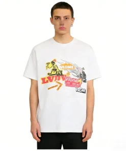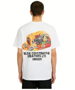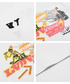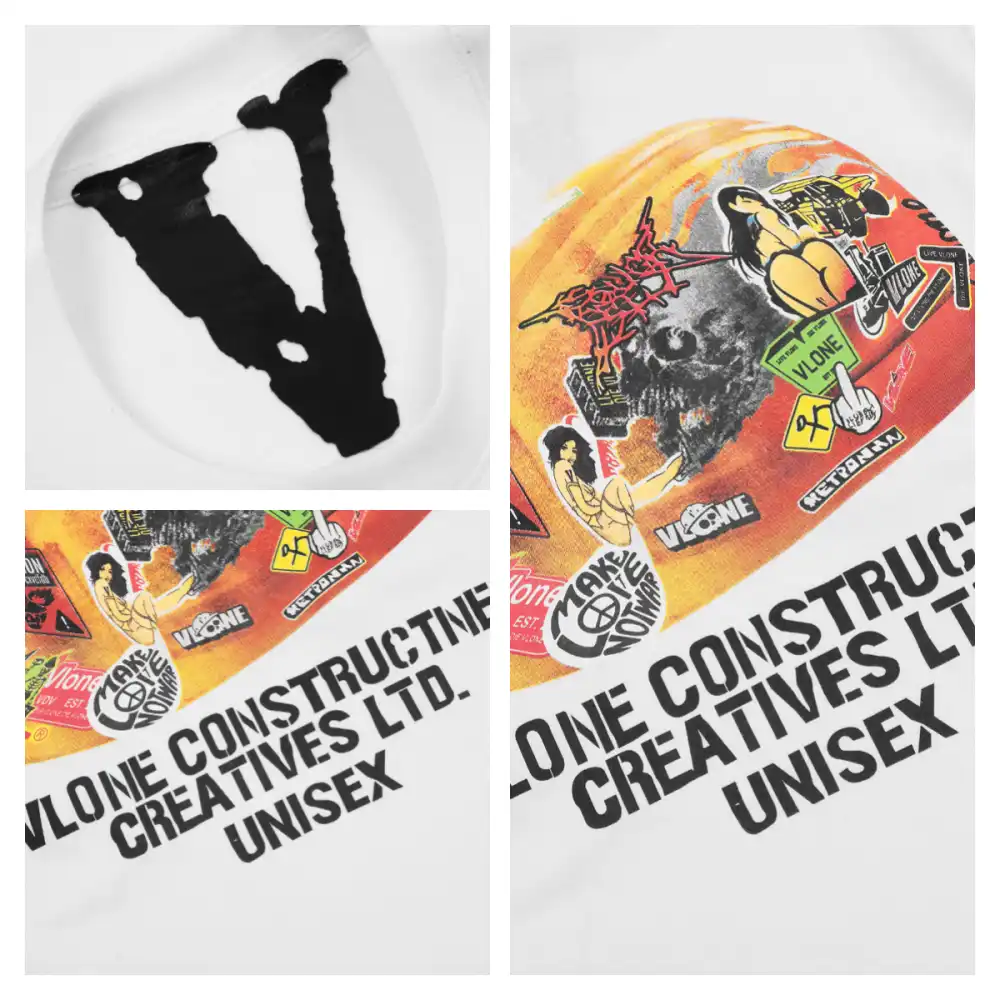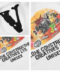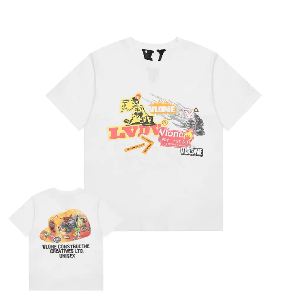 - This vibrant VLONE tee features a front collage of bold graphics, including a fiery skeleton skateboarder, the iconic “VLONE” logo, and the “LVDV” stamp in a mix of neon orange, yellow, and red hues, accented by a smoking “V” graphic and flame details for a high-energy, punk-inspired vibe. The back showcases a colorful, graffiti-style “VLONE” cap graphic filled with chaotic, layered designs, paired with the text “VLONE CONSTRUCTIVE CREATIVES LTD.