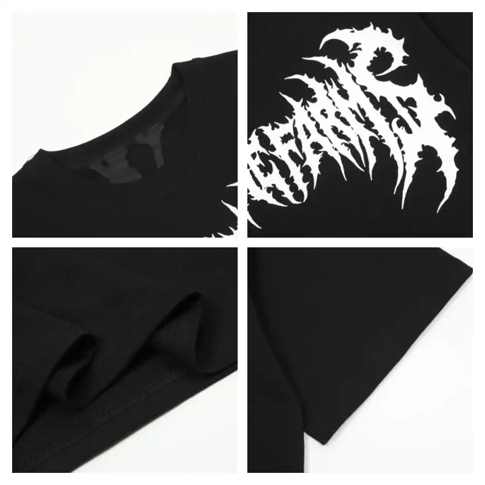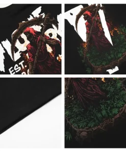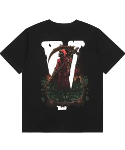 - Features the “VLONE FARMS” logo rendered in an exaggerated, spiky Gothic font (black color)—the intricate, sharp lettering creates a bold, dark-edged visual that aligns with streetwear’s rebellious vibe. Back centers on VLONE’s signature “V” symbol, layered with a graphic of a hooded figure (in red robes) surrounded by plant/root elements. The dark, atmospheric design reinforces the “Farms” theme while amplifying the brand’s iconic aesthetic.