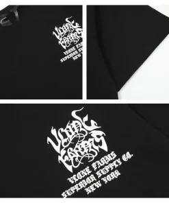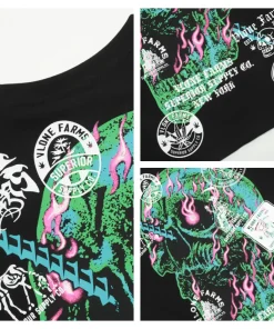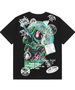 - Features “VLONE FARMS” (in Gothic font) paired with “SUPERIOR SUPPLY CO. NEW YORK” in black text, placed at the chest for a minimalist yet thematic base. Back displays a vibrant cyber-style skull graphic (blending green, pink, and black tones) with flame accents, plus brand logos/stamps—this futuristic, edgy design adds a high-visual-impact twist to the “Farms” theme, aligning with streetwear’s bold aesthetic.
