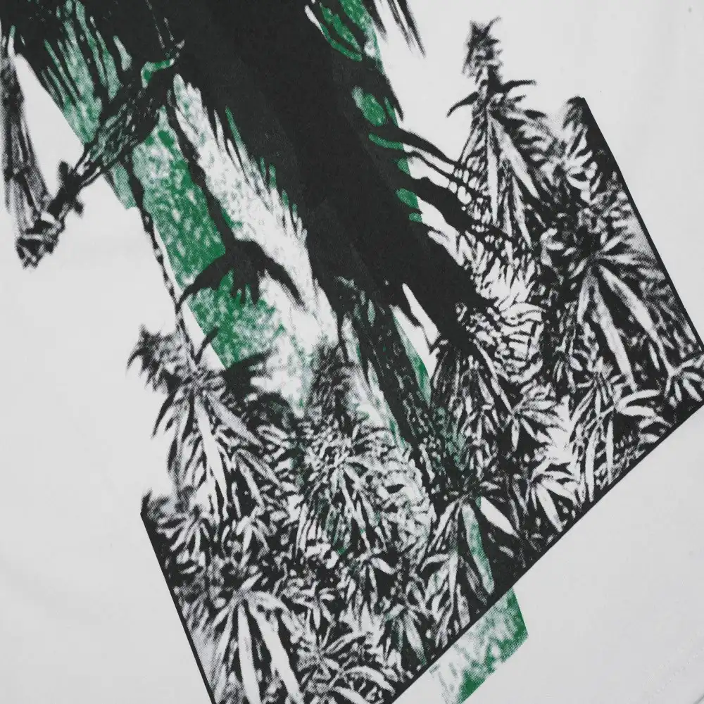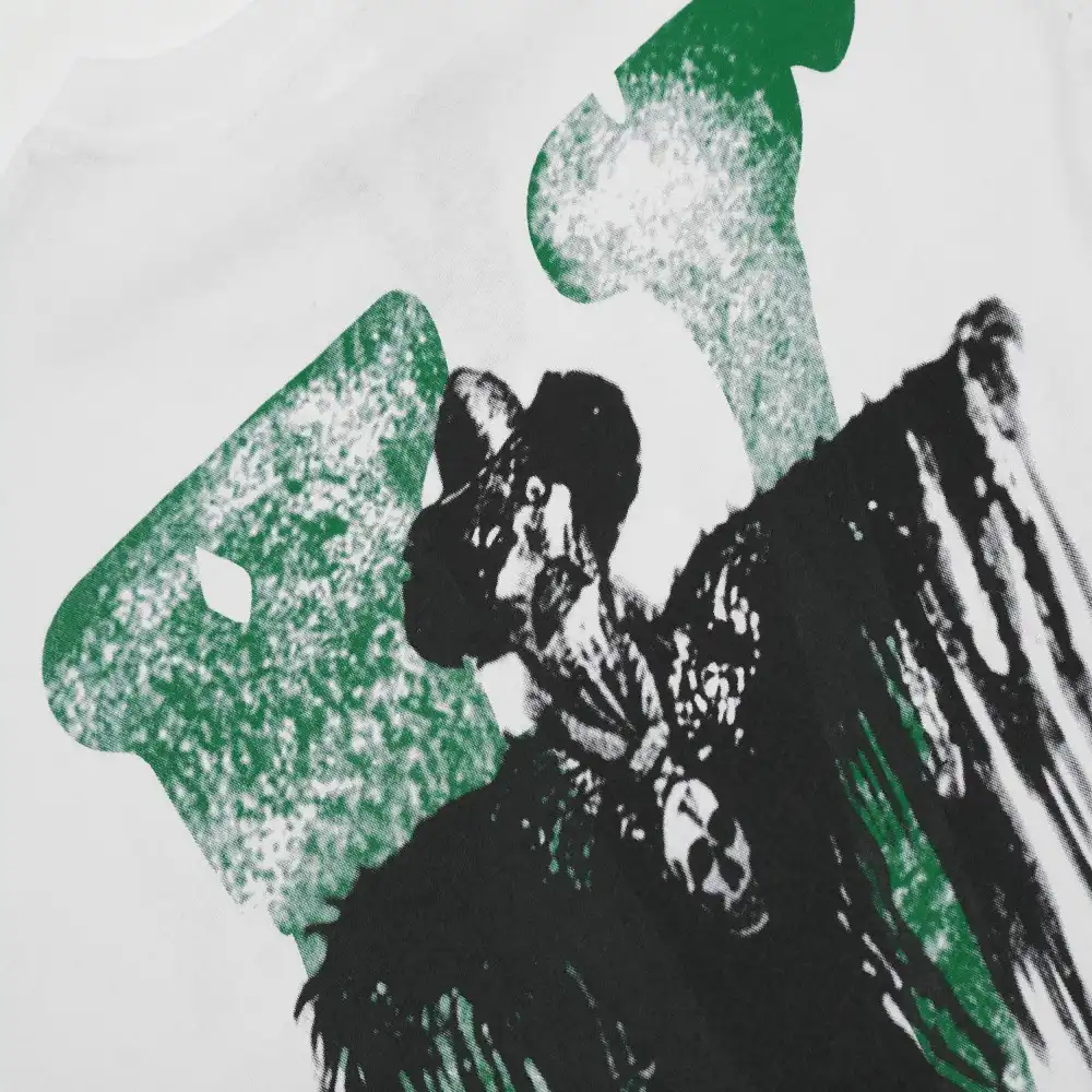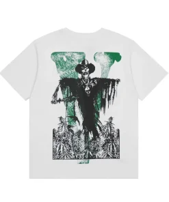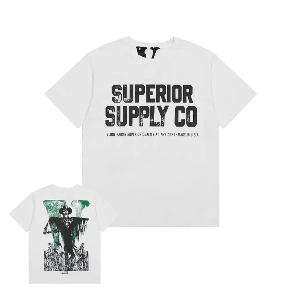 - Features “SUPERIOR SUPPLY CO” in bold, distressed black block letters (paired with the tagline “VLONE FARMS SUPERIOR QUALITY AT ANY COST – MADE IN U.S.A.”), using a rugged typography style to highlight the brand’s industrial-themed aesthetic. Back centers on VLONE’s signature “V” logo (in green distressed texture) as the background, layered with a graphic of a scarecrow + plant elements—this dark, rural-themed design reinforces the “Farms” concept while amplifying the streetwear edge.