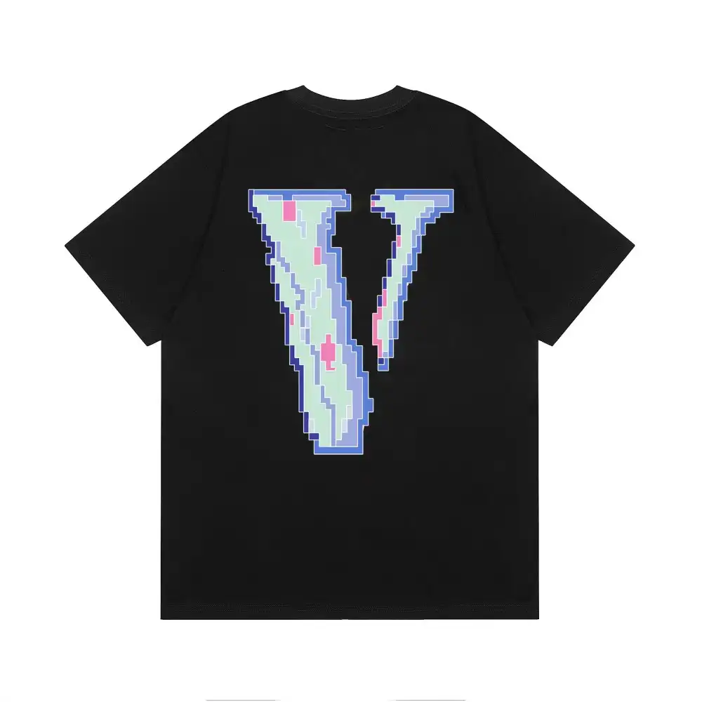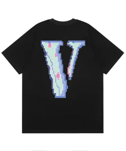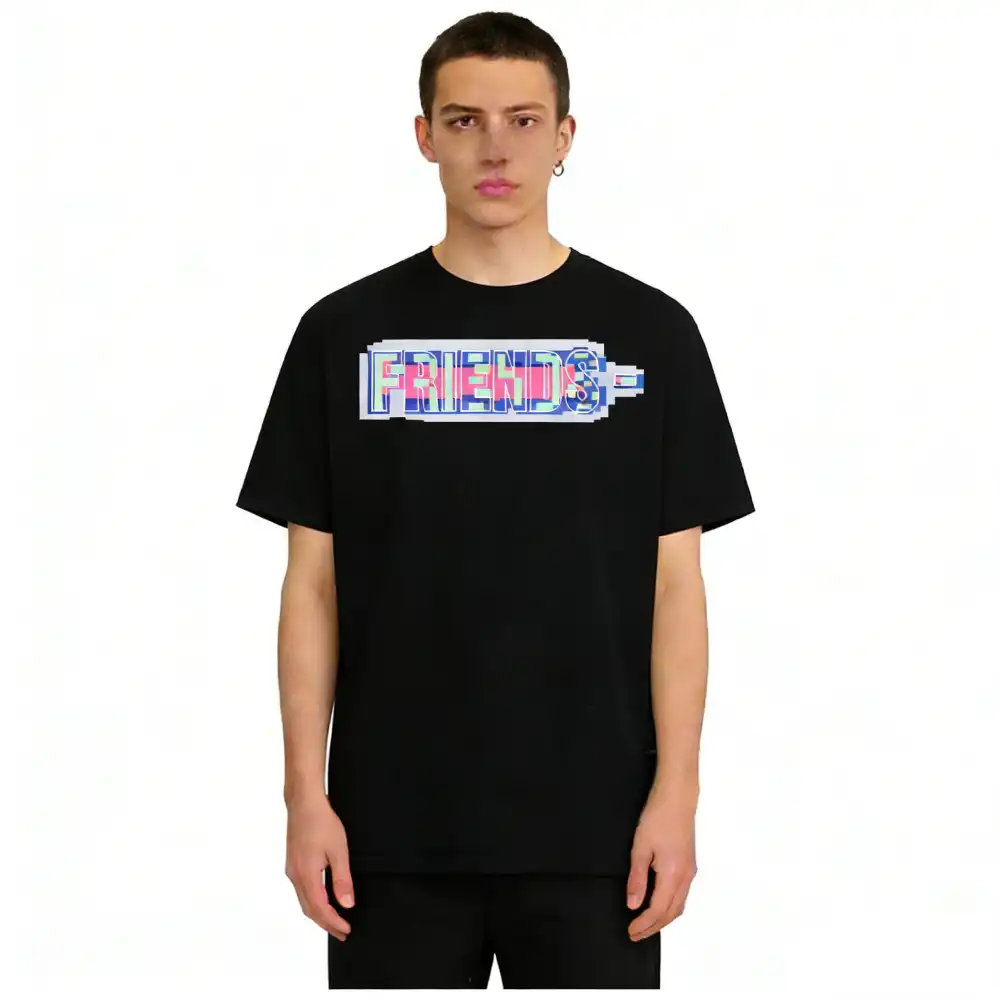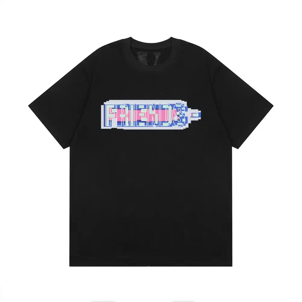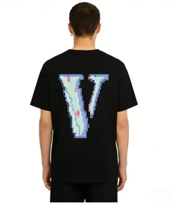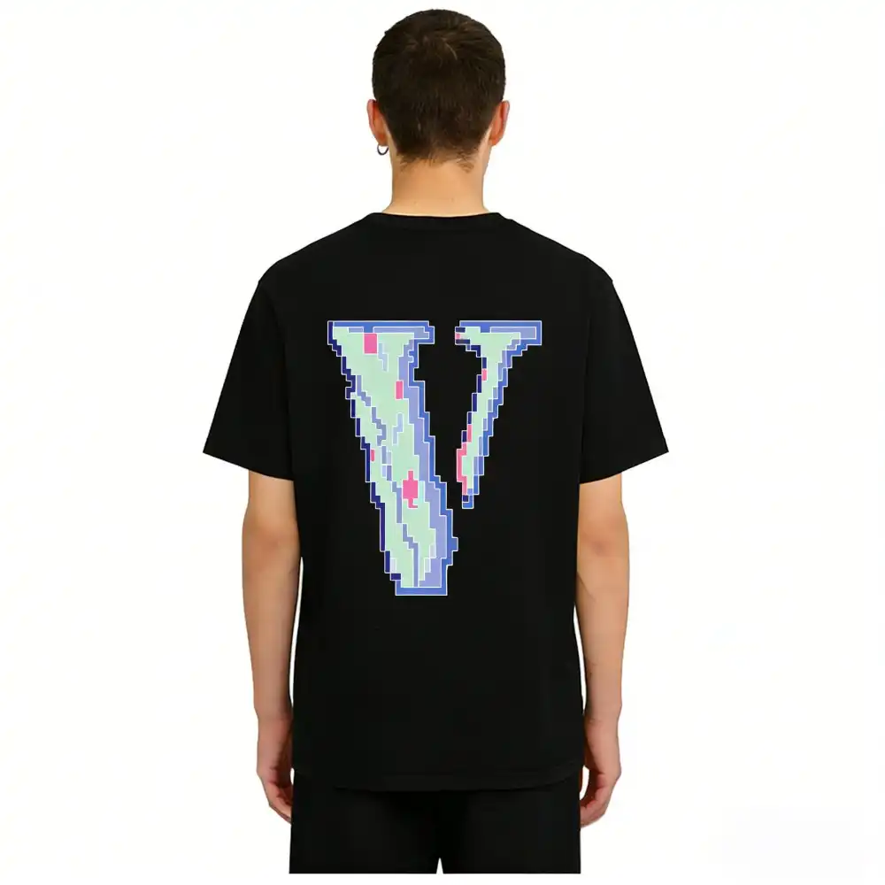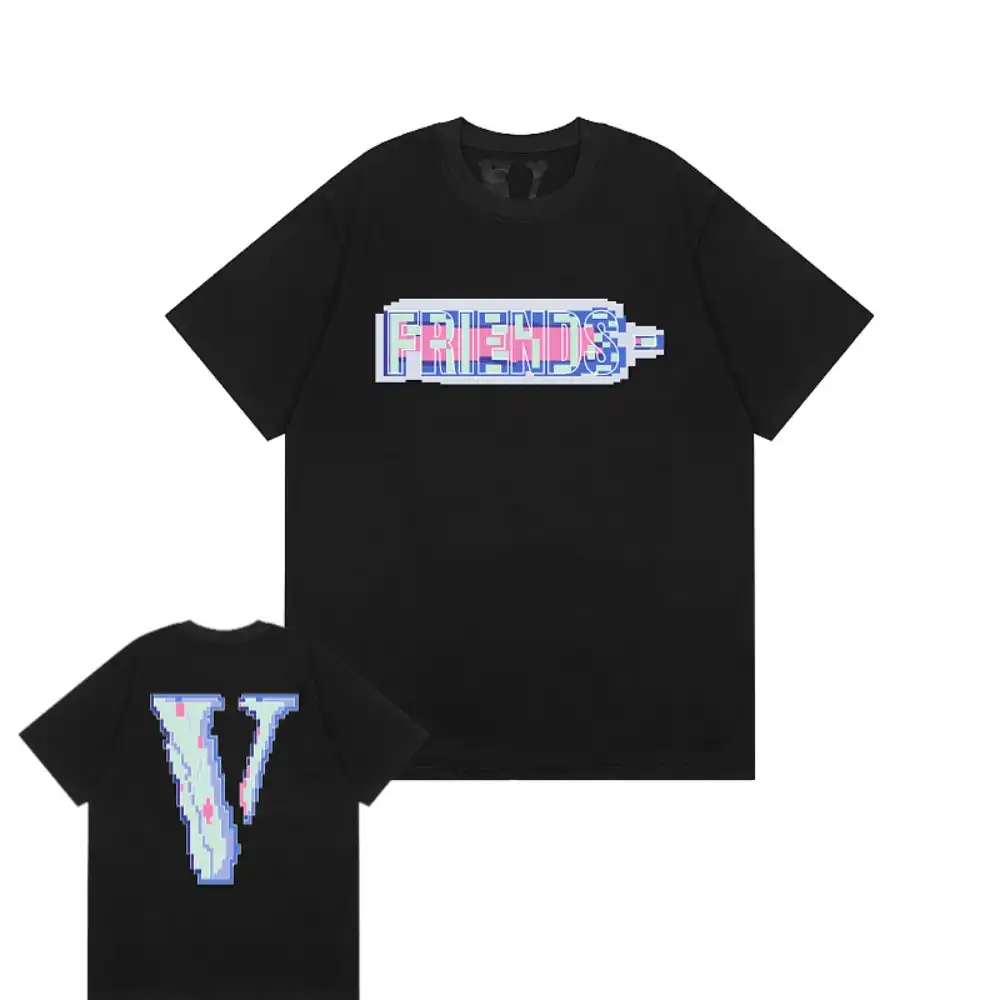 - This iconic VLONE tee features the brand’s signature “FRIENDS-” slogan on the chest, rendered in a vibrant, pixelated 8-bit style with a mix of pink, blue, and purple hues that evoke a retro gaming aesthetic. The back showcases an oversized “V” logo filled with the same pixelated pattern, creating a cohesive, nostalgic design that merges VLONE’s rebellious streetwear identity with a playful nod to 90s digital culture.
