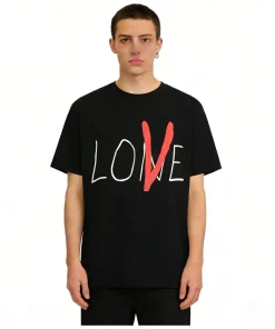 - This artistic VLONE tee features a front graphic of the word “LOVE” rendered in a raw, handwritten-style black font, with the “V” highlighted in a bold, striking red that doubles as the brand’s iconic logo, creating a romantic yet edgy statement. The back showcases an oversized red “V” logo in the same hand-drawn style, ensuring a cohesive, minimalist aesthetic that balances subtle sentiment with bold streetwear branding.