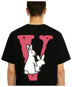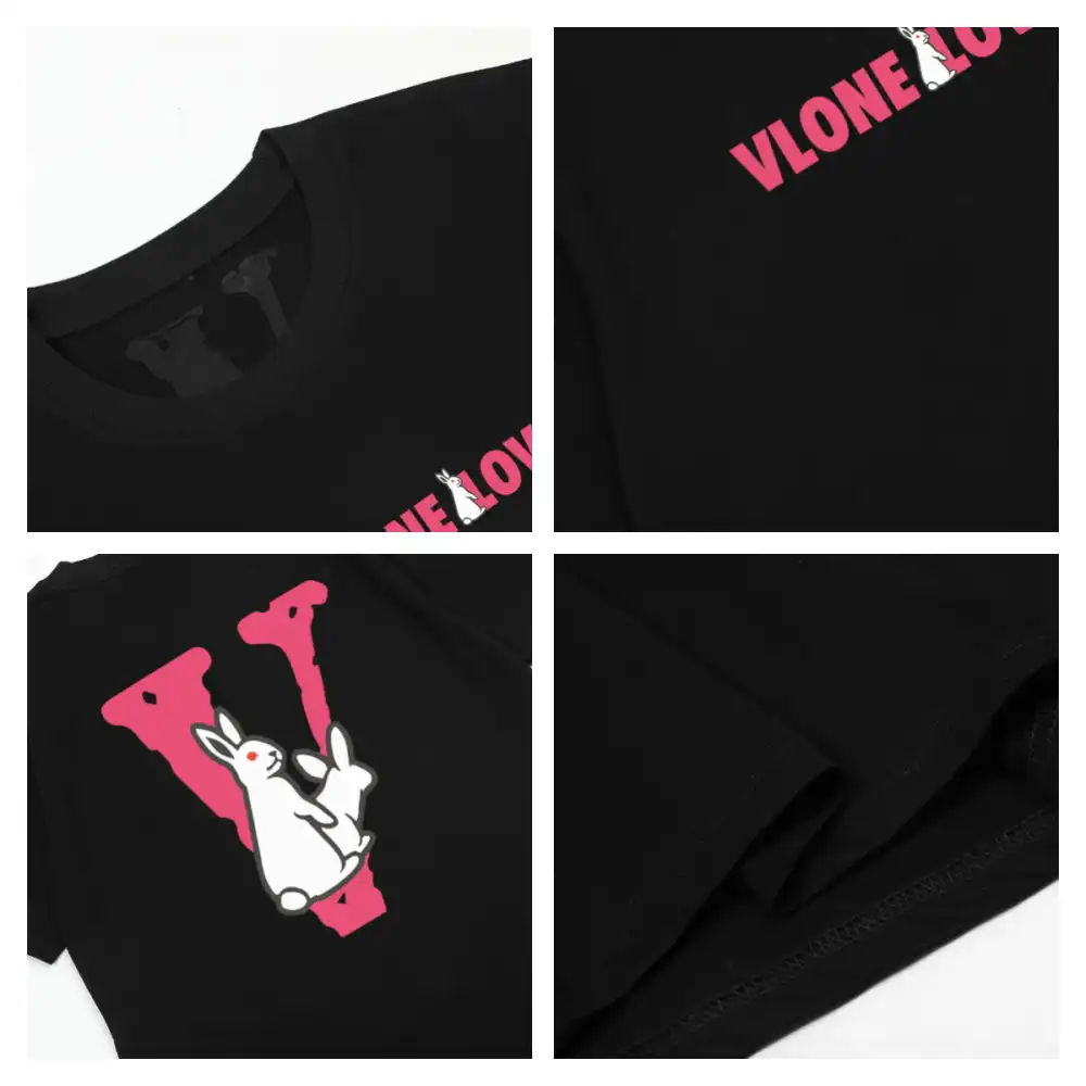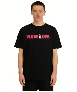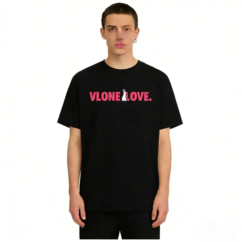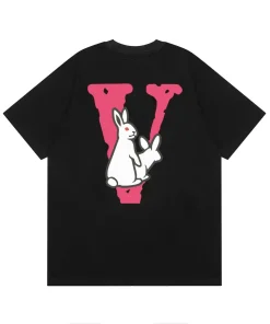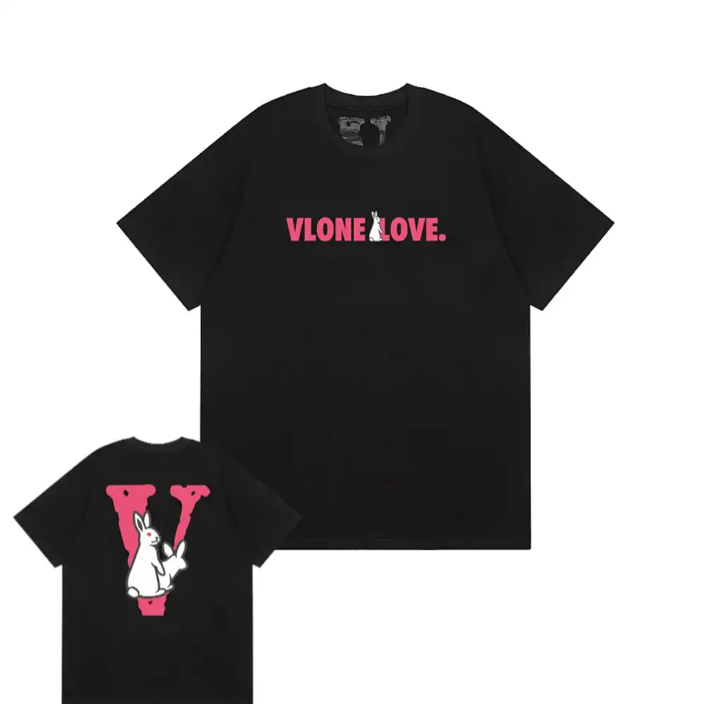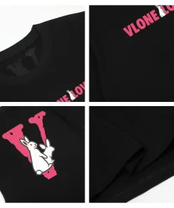 - This VLONE tee features the bold “VLONE LOVE.” slogan on the chest in vibrant pink, accented by a playful white bunny graphic that adds a whimsical, subversive twist to the brand’s iconic edge. The back showcases an oversized pink “V” logo with the same bunny character at its center, creating a cohesive, eye-catching design that blends VLONE’s rebellious streetwear identity with a lighthearted, romantic vibe.