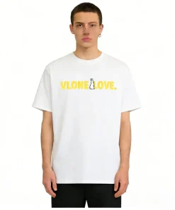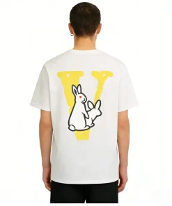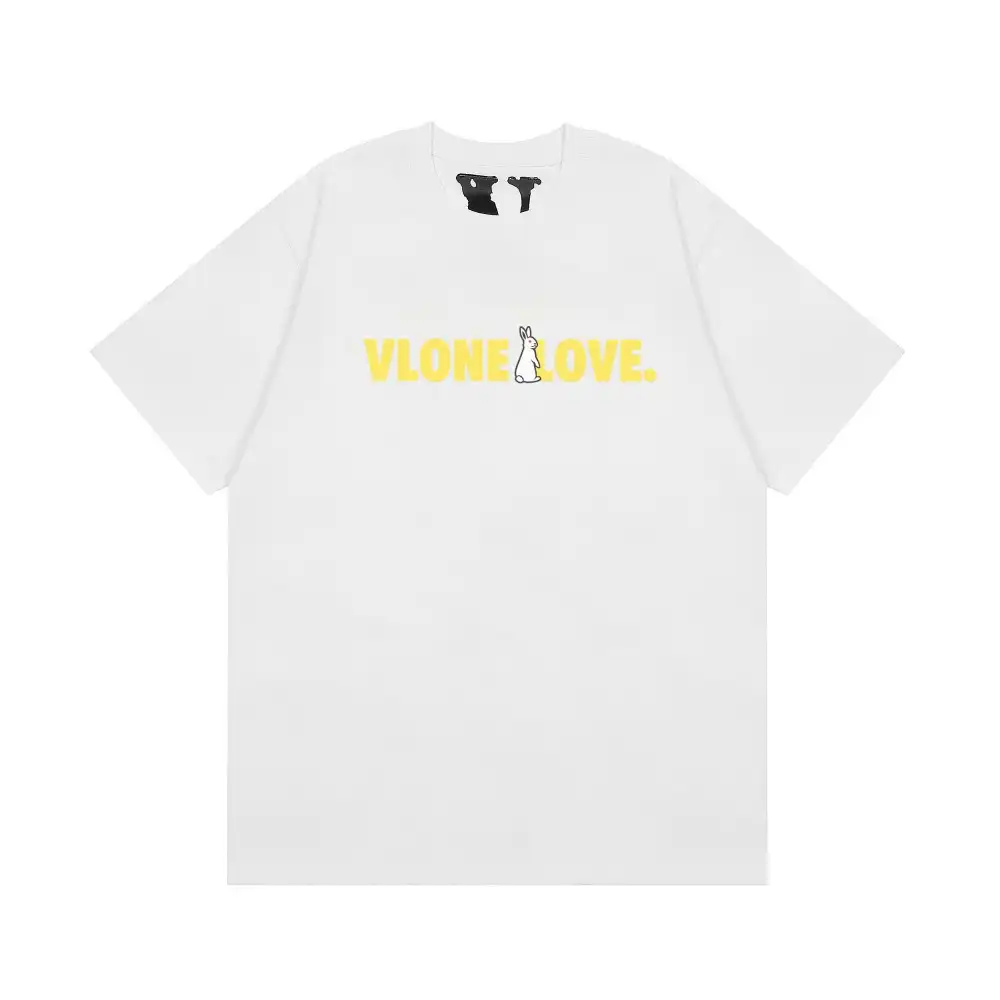 - This VLONE tee features the bold “VLONE LOVE.” slogan on the chest in vibrant yellow, accented by a playful white bunny graphic that adds a whimsical, subversive twist to the brand’s iconic edge. The back showcases an oversized yellow “V” logo with the same bunny character at its center, creating a cohesive, eye-catching design that blends VLONE’s rebellious streetwear identity with a lighthearted, romantic vibe.