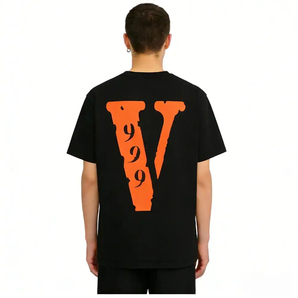 - Highly versatile, the Vlone X 999 X Juice Wrld Orange V Logo Black Tee can be seamlessly styled with all kinds of bottoms to achieve a relaxed, cozy daily outfit.