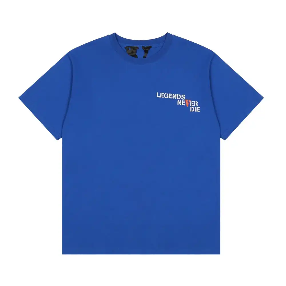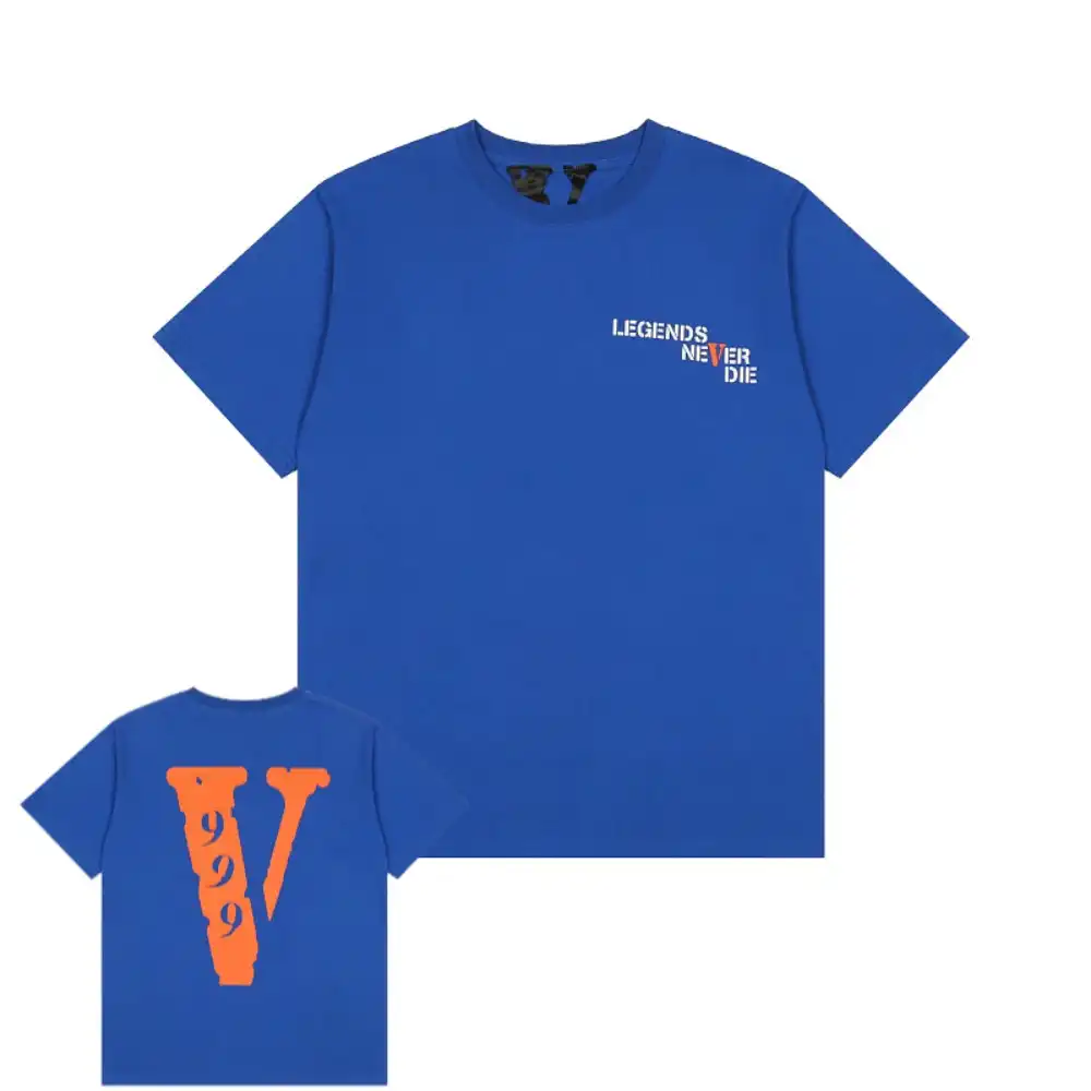 - This VLONE x Juice WRLD collaborative tee features the iconic “LEGENDS NEVER DIE” slogan printed on the chest, with the “V” highlighted in a vibrant orange that nods to both VLONE’s signature logo and Juice WRLD’s “999” legacy. The back showcases an oversized orange “V” logo, infused with the “999” graphic to honor the late rapper’s enduring impact, creating a heartfelt tribute that merges streetwear with hip-hop history.