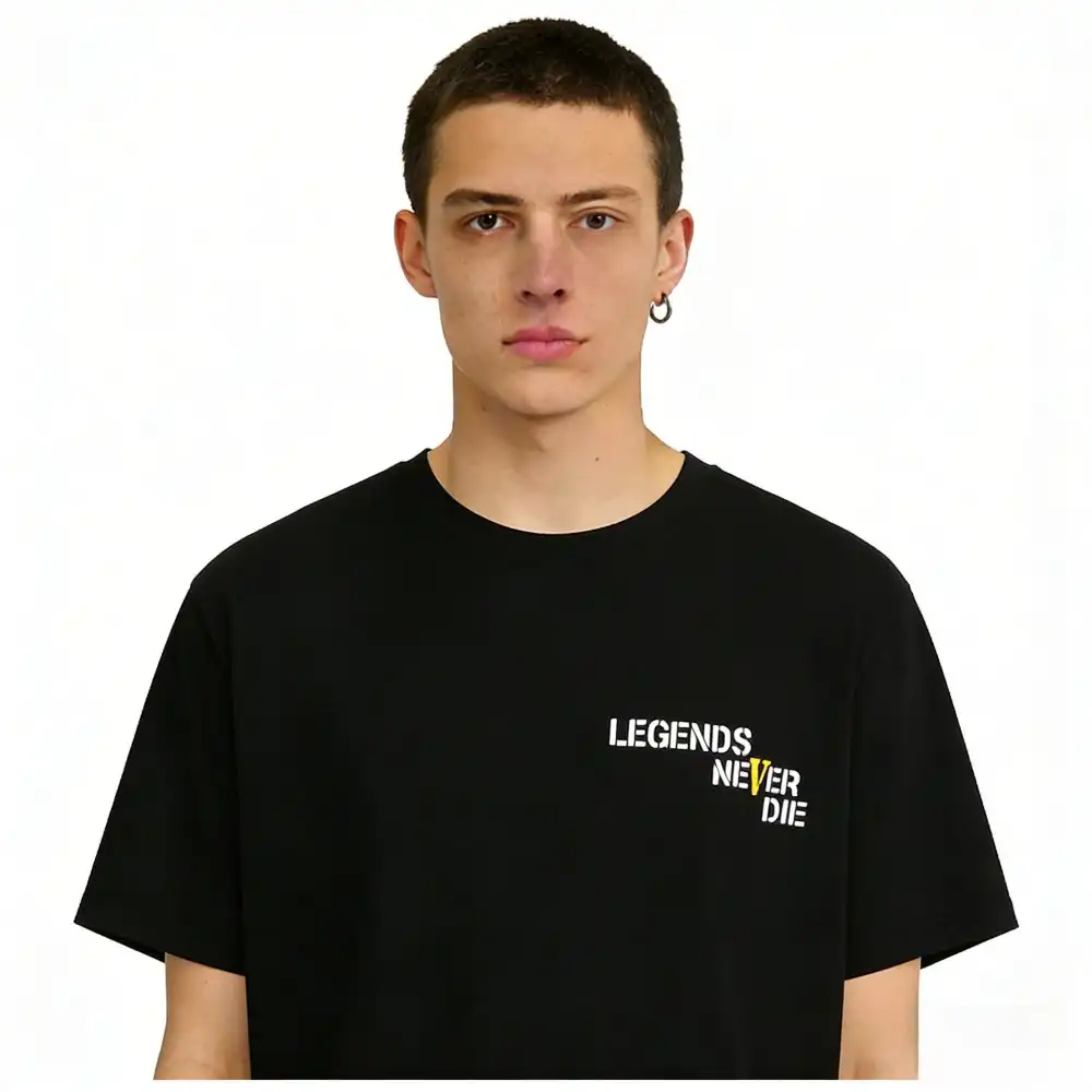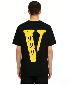 - This VLONE x Juice WRLD collaborative tee features the iconic “LEGENDS NEVER DIE” slogan printed on the chest, with the “V” highlighted in a vibrant yellow that nods to both VLONE’s signature logo and Juice WRLD’s “999” legacy. The back showcases an oversized yellow “V” logo, infused with the “999” graphic to honor the late rapper’s enduring impact, creating a heartfelt tribute that merges streetwear with hip-hop history.