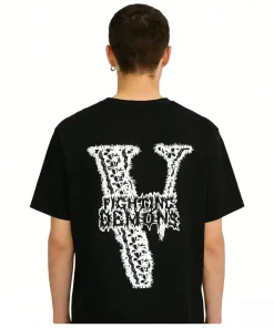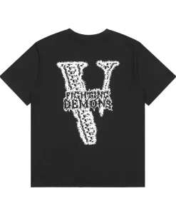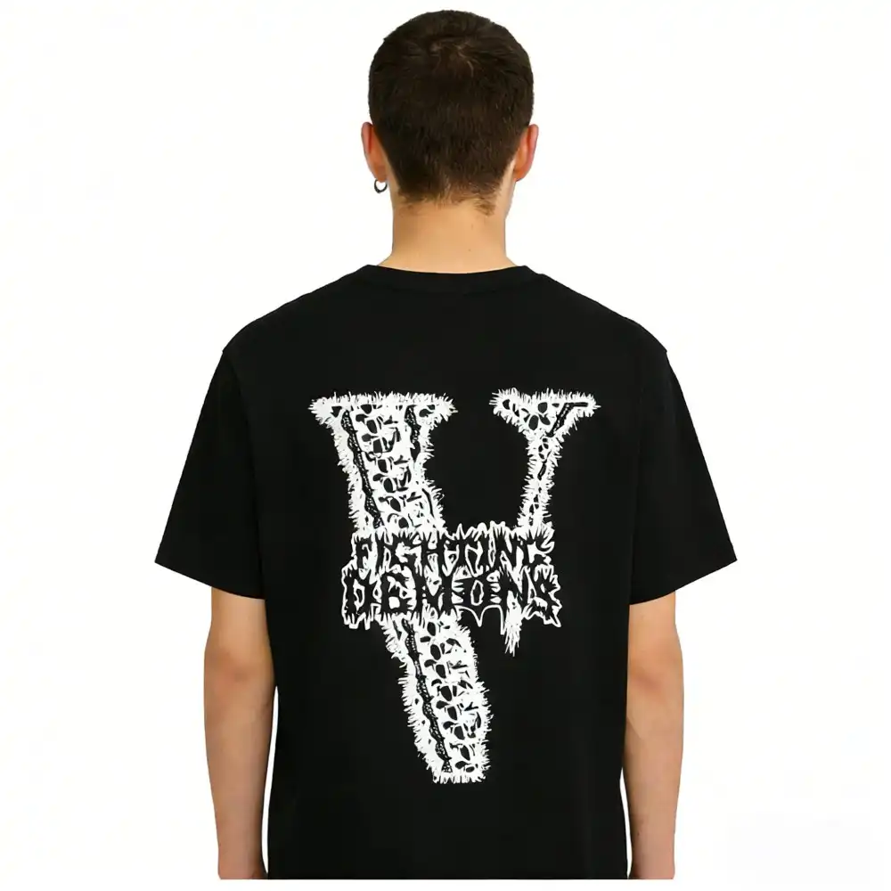 - This edgy VLONE tee features a front graphic of a distorted, skeletal hand print in a stark black-and-white, ink-splatter style, evoking a raw, unsettling aesthetic that blends streetwear with horror-inspired edge. The back showcases an oversized “V” logo filled with the intricate “DEMONS” text in a matching distressed, high-contrast pattern, creating a cohesive, statement-making design that embodies VLONE’s rebellious spirit.