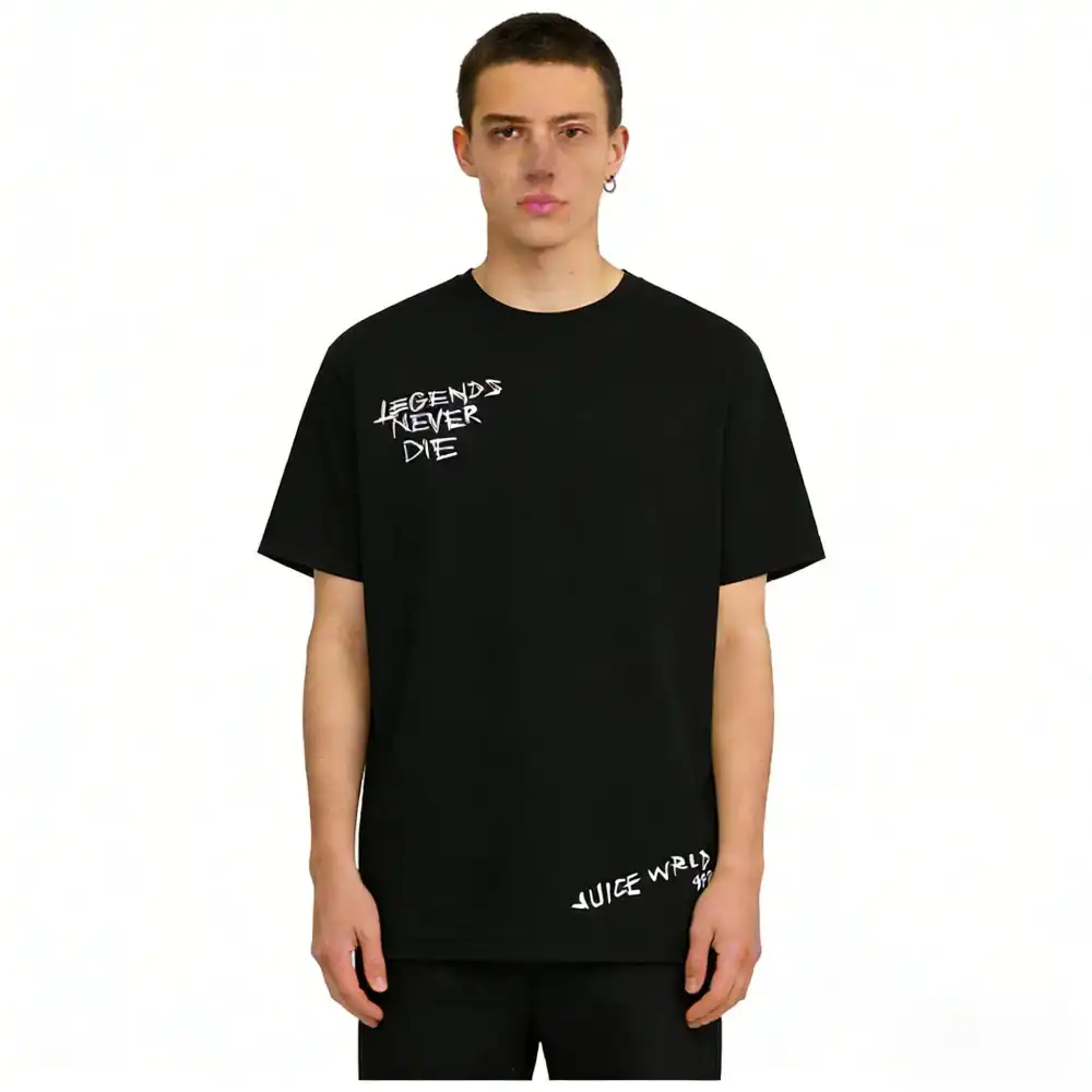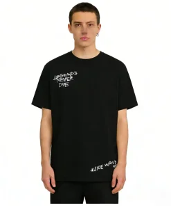 - Highly versatile, the Vlone X Juice Wrld Legends Never Die Black Tee can be seamlessly styled with all kinds of bottoms to achieve a relaxed, cozy daily outfit.