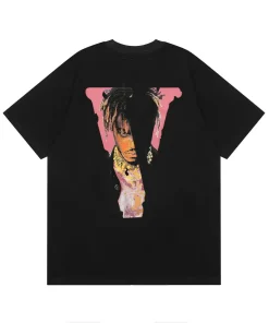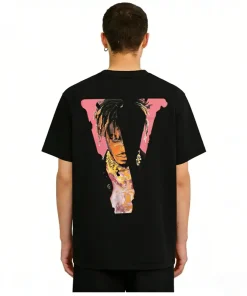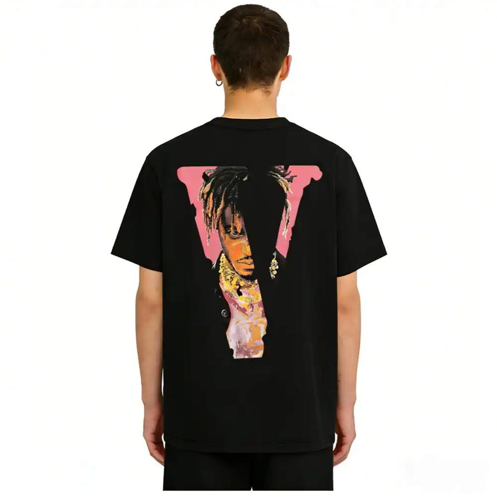 - This VLONE x Juice WRLD tribute tee features the handwritten-style “LEGENDS NEVER DIE” slogan on the chest and “JUICE WRLD 999” on the lower hem, capturing the raw, emotional energy of the late rapper’s legacy. The back showcases an oversized “V” logo filled with a vibrant, abstract portrait of Juice WRLD, merging VLONE’s iconic streetwear identity with a heartfelt artistic homage.