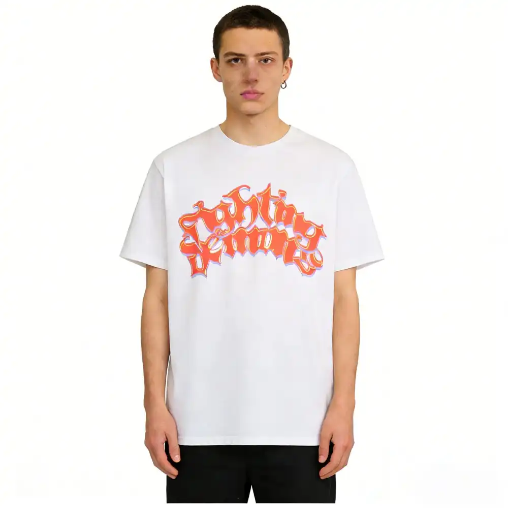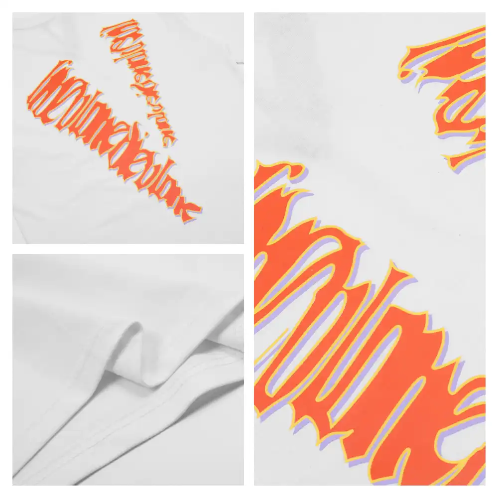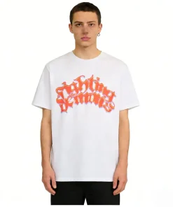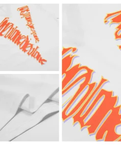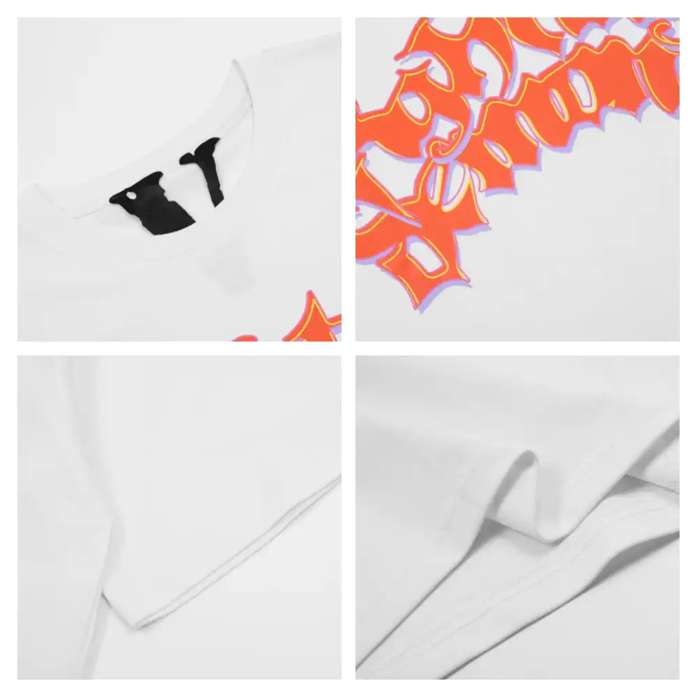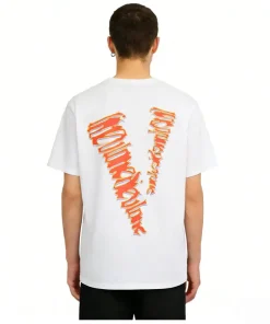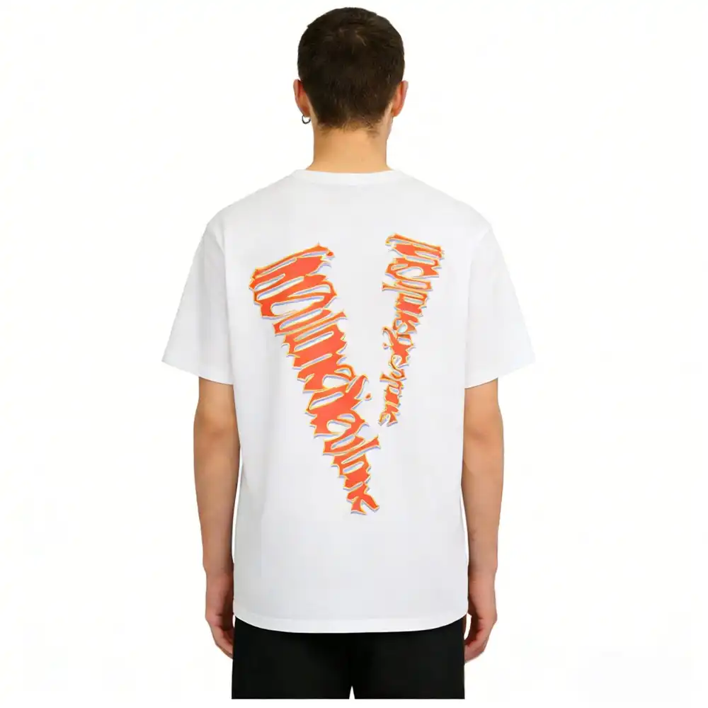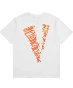 - This bold VLONE tee features a front graphic of the “VLONE” logo rendered in a fiery, dripping orange-and-pink graffiti-style font, creating a high-energy, chaotic aesthetic that embodies the brand’s rebellious streetwear spirit. The back showcases an oversized “V” logo filled with the same distorted, neon-hued lettering, ensuring a cohesive, eye-catching design that demands attention.