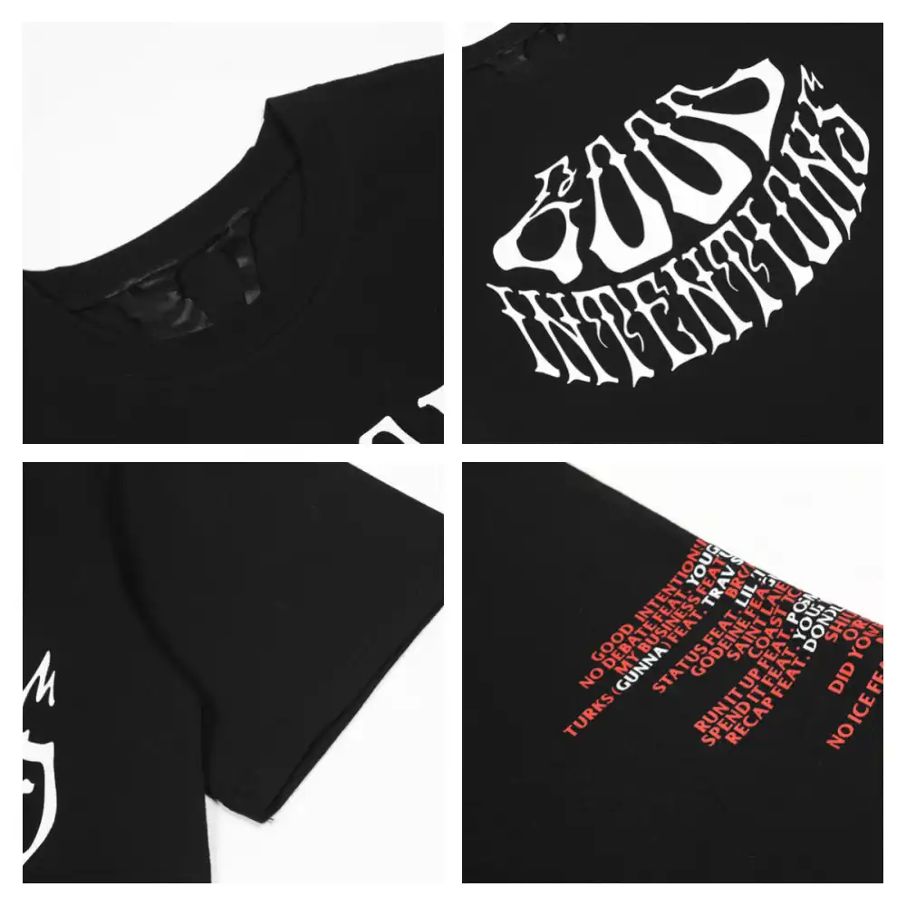 - This VLONE x Nav collaborative tee features the “GOOD INTENTIONS” album title on the chest in a distorted, organic black font that evokes a raw, handcrafted aesthetic, capturing the project’s blend of hip-hop edge and emotional depth. The side hem showcases a detailed tracklist from the album, while the back displays an oversized, bold black “V” logo that merges VLONE’s iconic streetwear identity with Nav’s artistic vision.
