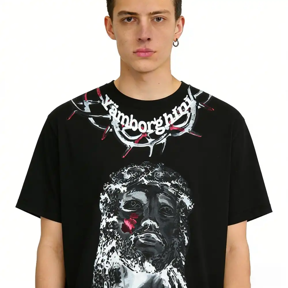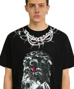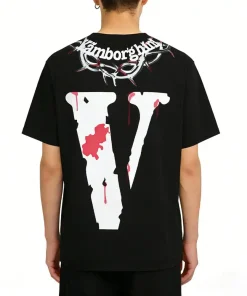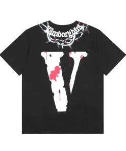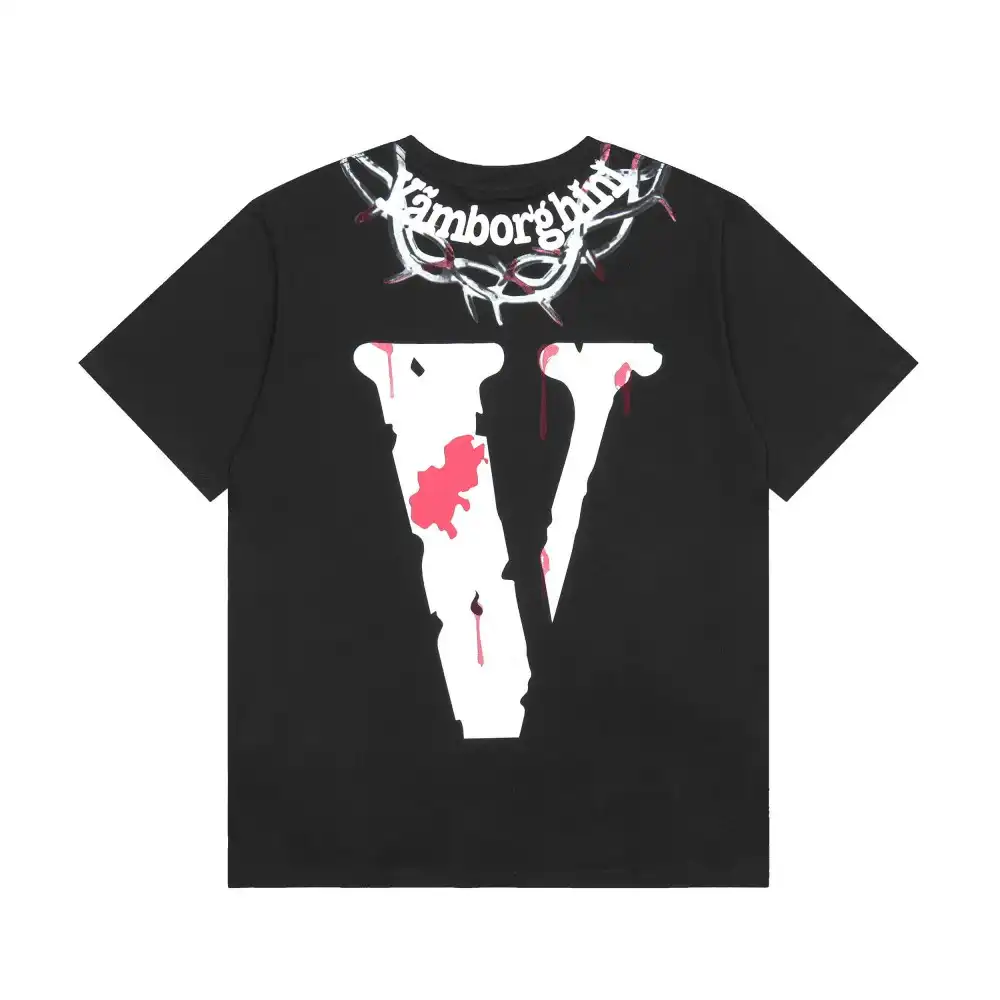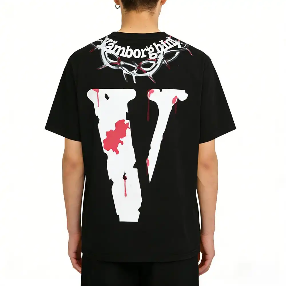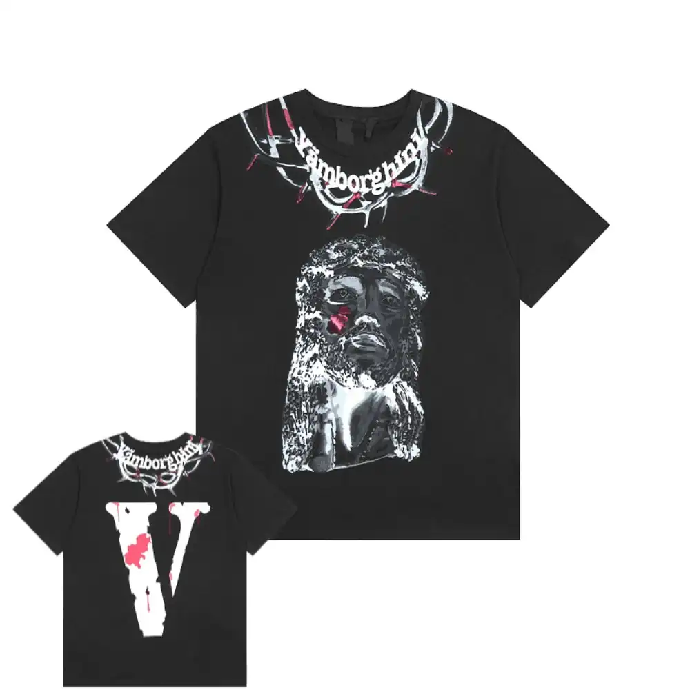 - This striking VLONE tee features a front graphic of a hyper-stylized, monochromatic portrait of a crowned figure with a subtle red accent on the cheek, paired with a thorny crown graphic across the neckline that bears the “VLONE” script in a dripping, raw style. The back showcases an oversized “V” logo in bold black with splatters of red, mirroring the front’s dramatic, religiously inspired aesthetic, creating a cohesive design that merges streetwear edge with provocative artistic expression.